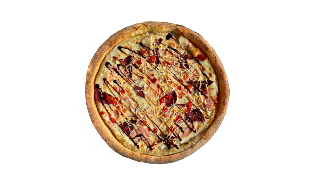 Сыр моцарелла,сыр пармезан,ветчина куриная,курица копченная,сочная говядина,помидоры,крансый лук,фирменный соус,присутствует бальзамик