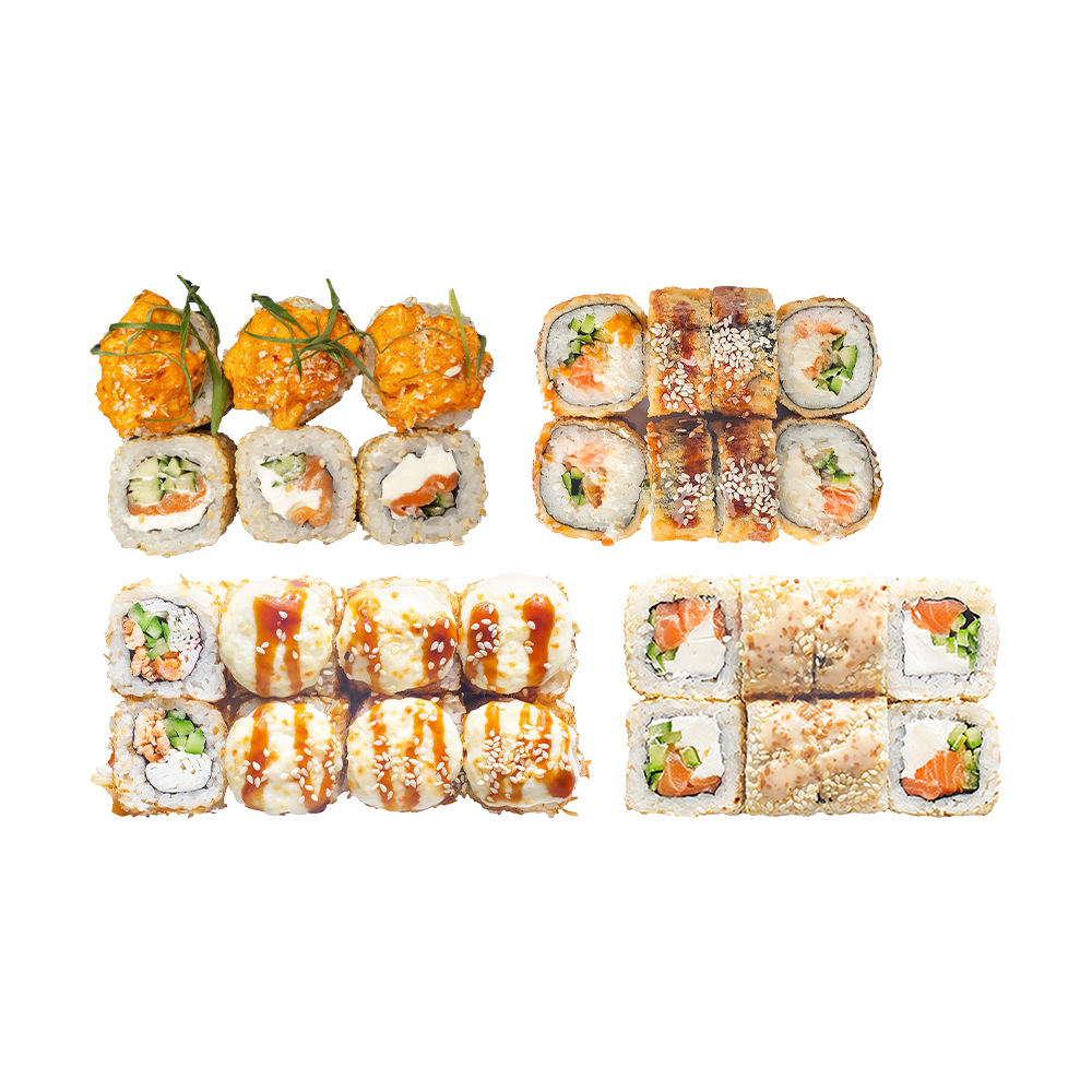 *Только на доставку и самовывоз Унаги райс, сяки темпура, аляска ролл, асакуро 4 соевых соуса, 2 васаби, 2 имбиря
