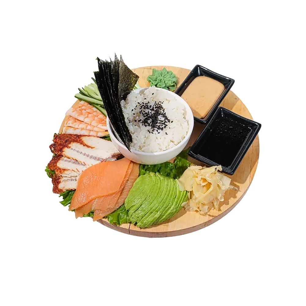 лосось, креветки, угорь, огурец, авокадо, нори, рис, соус соевый, соус ореховый