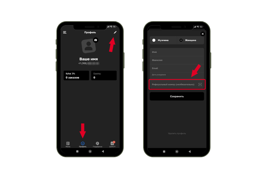 - Друг скачивает приложение YAKUZA SUSHI и регистрируется, указывая твой номер в поле "Реферальный номер" при заполнении профиля.